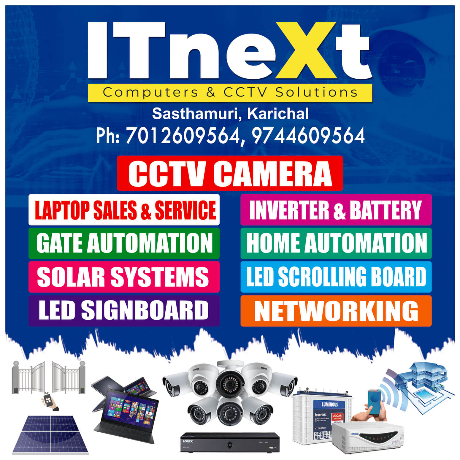 Welcome to ITnext Computers & CCTV Solutions! CCTV Dealer Based in Haripad, Alappuzha, Kerala, ITnext is No.1 Best Selling CCTV Installation and Computer Sales and Service team in Haripad Alappuzha. We specialize in comprehensive solutions for CCTV installation and service, computer sales and service, home automation, gate automation, inverter and battery sales, LED scroll board sales, and LED sign board installation. With our expertise and dedication, we ensure top-notch products and services tailored to meet your specific requirements. Explore our wide range of offerings and experience unmatched reliability and professionalism. Contact us today to transform your space with cutting-edge technology!